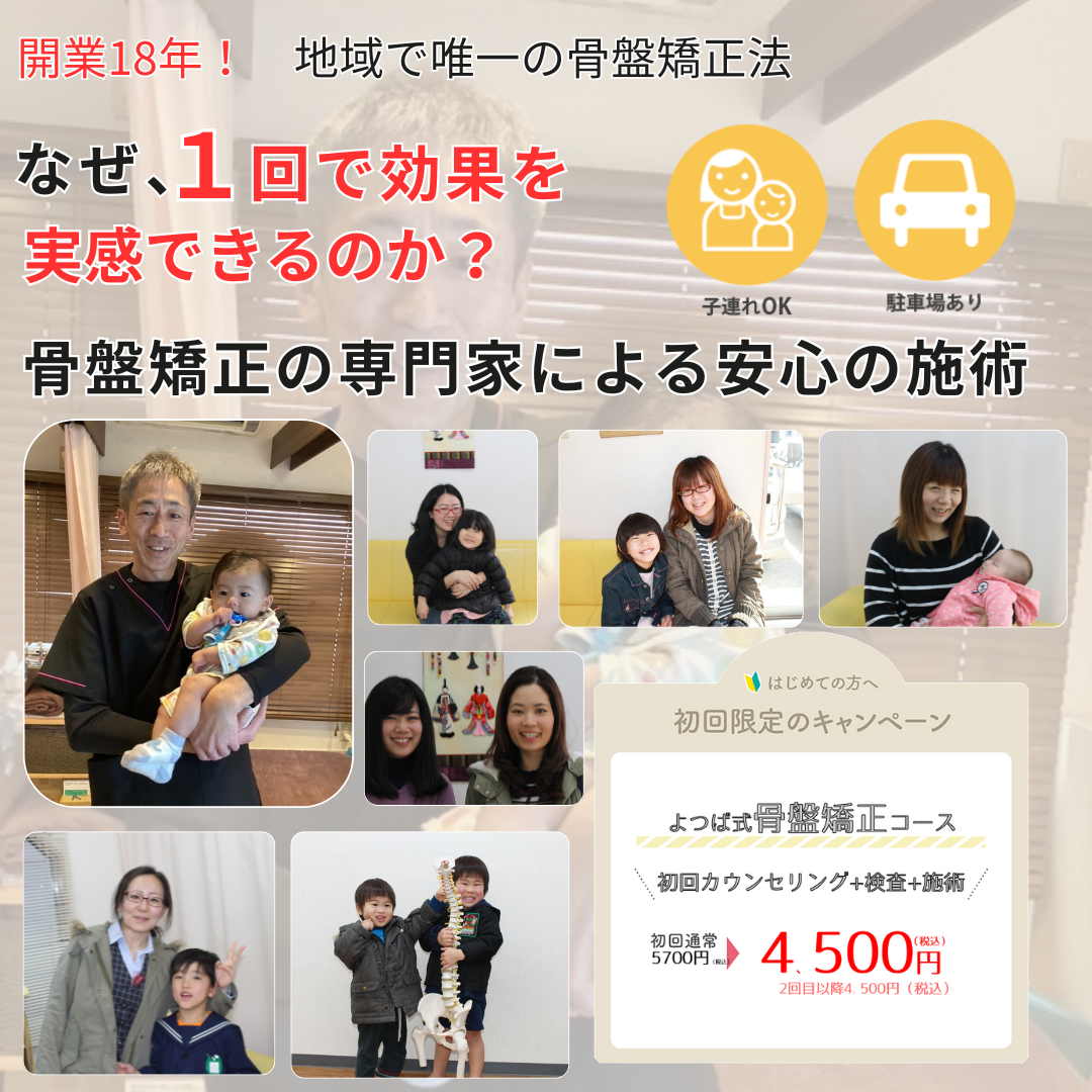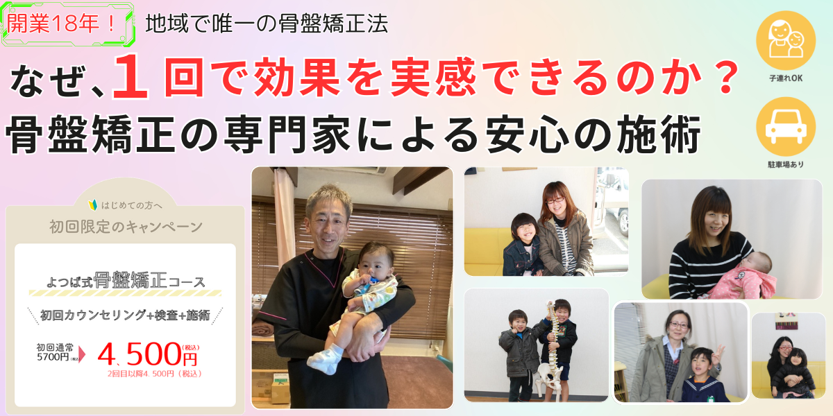 当院には他で骨盤がズレていると言われたが治してもらえなかった方や、どこに行っても良くならなかった方が多数来院されております。「よつばに行けば何とかしてもらえるよ」といった推薦の声を頂いております。